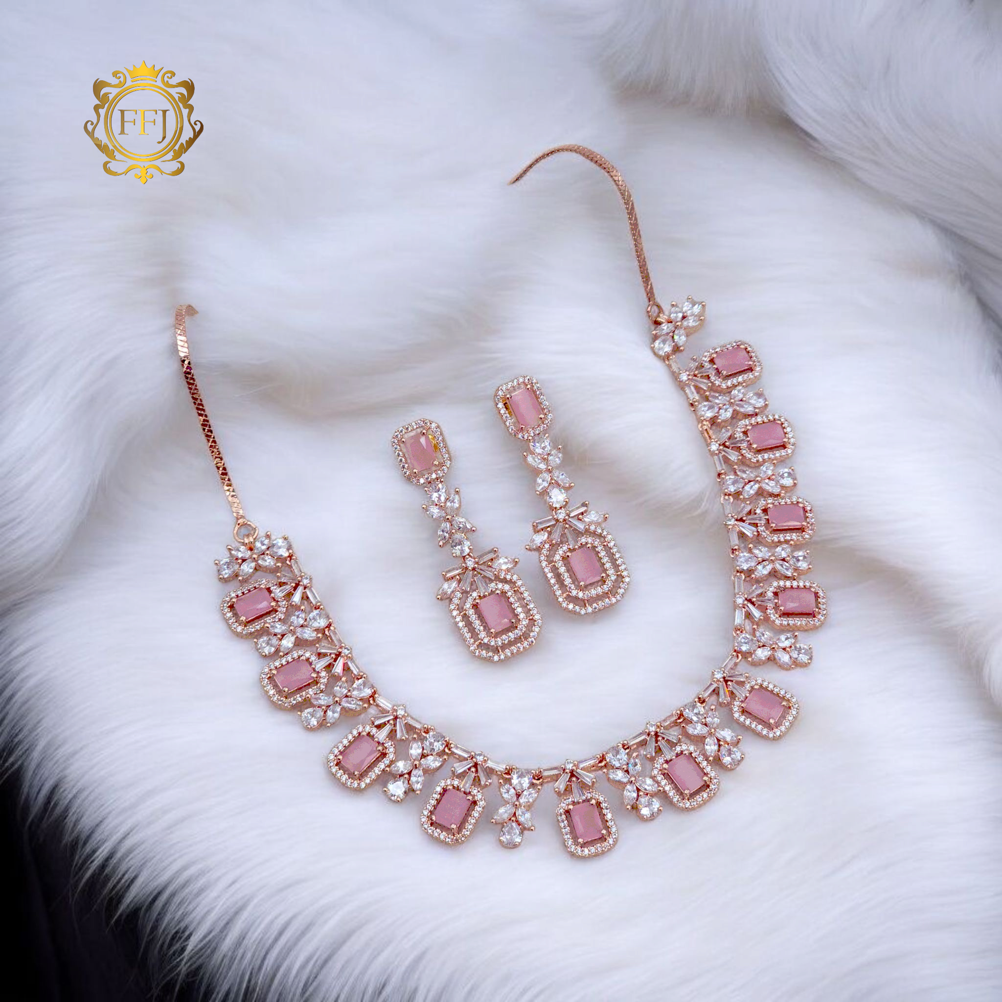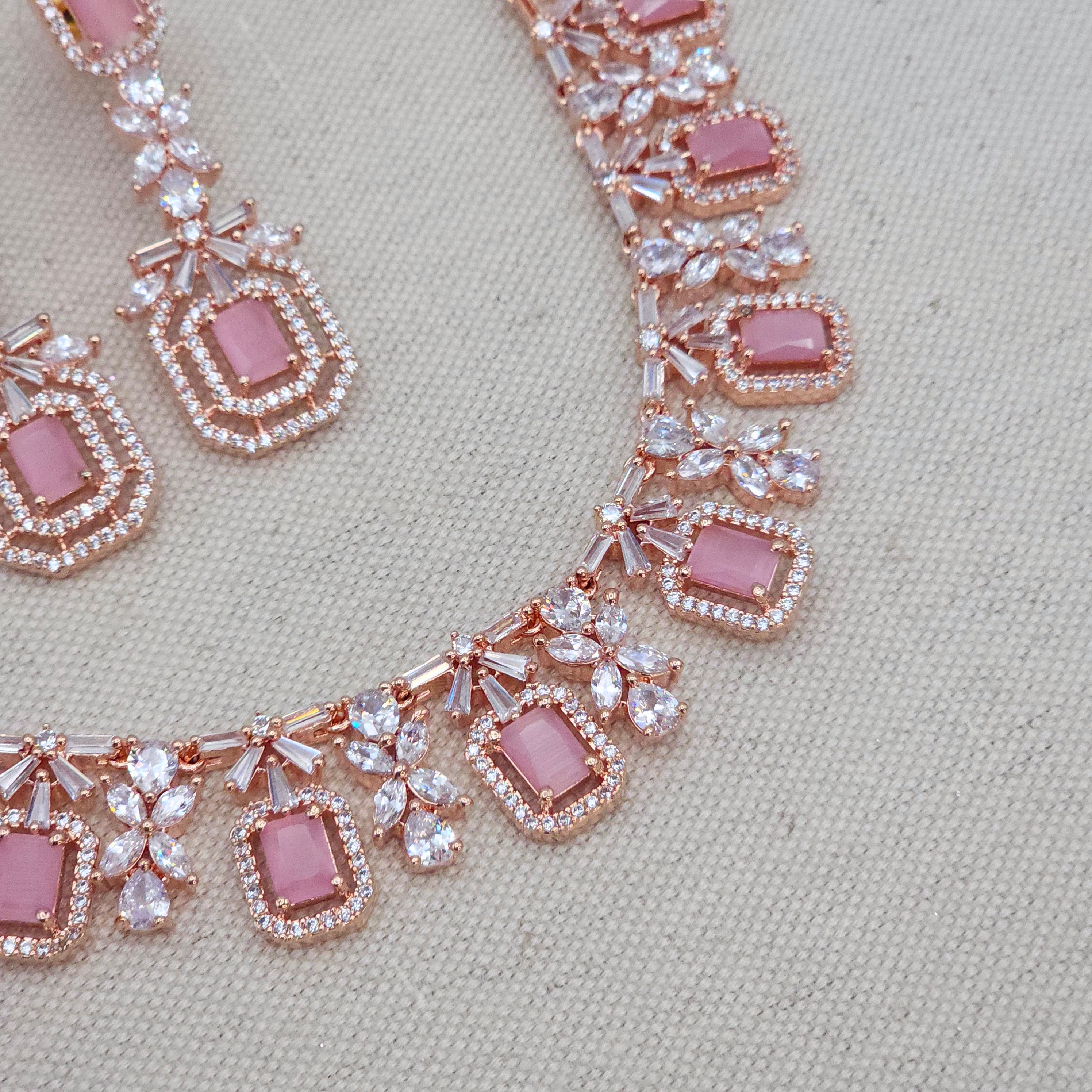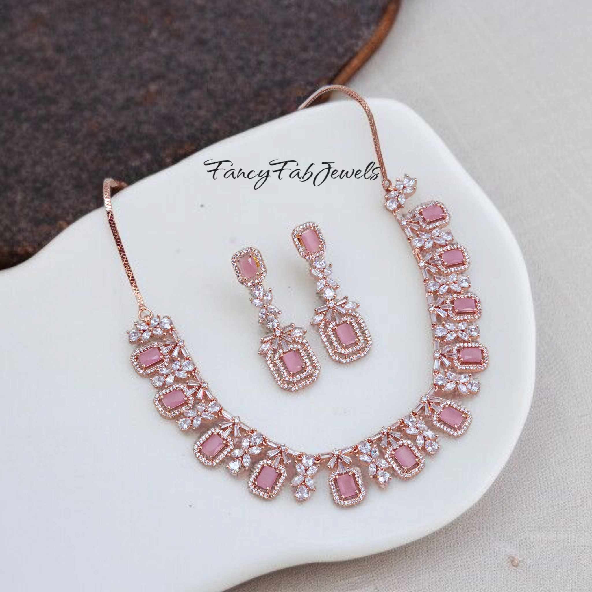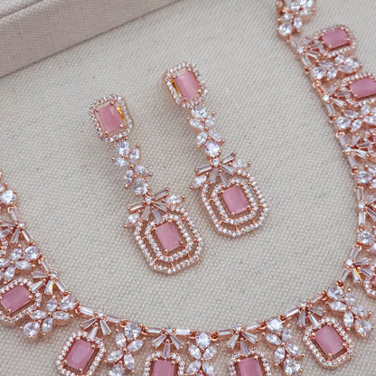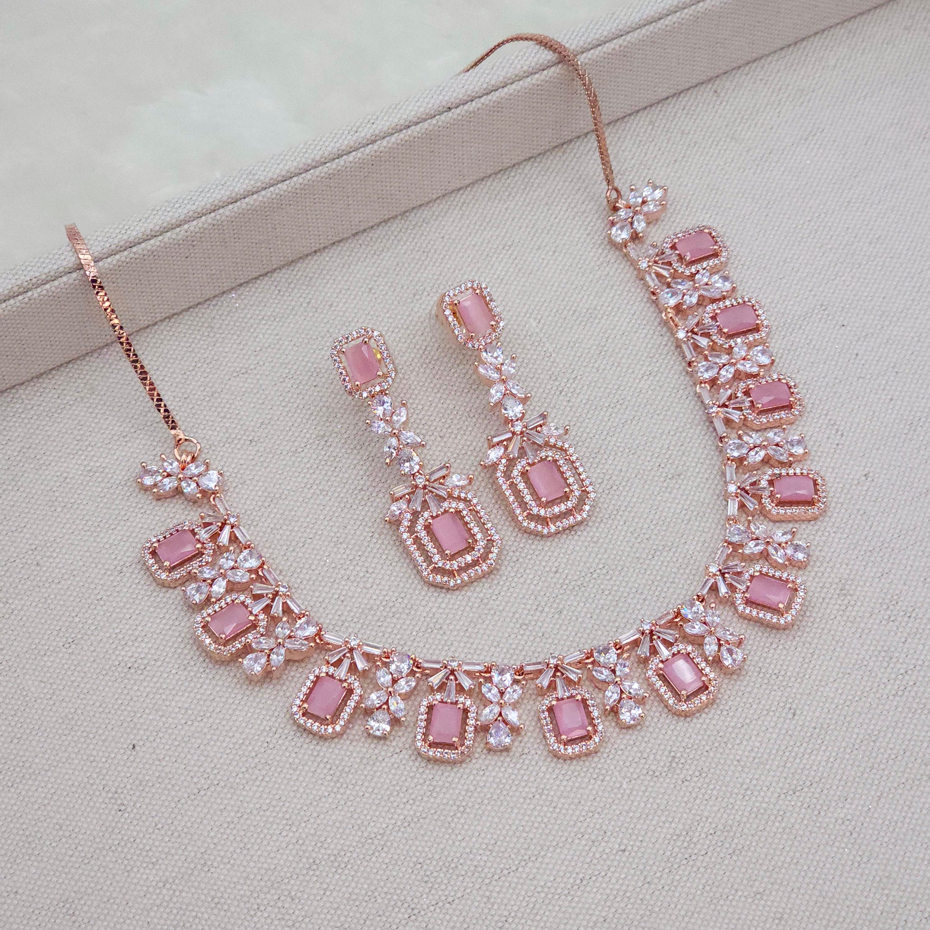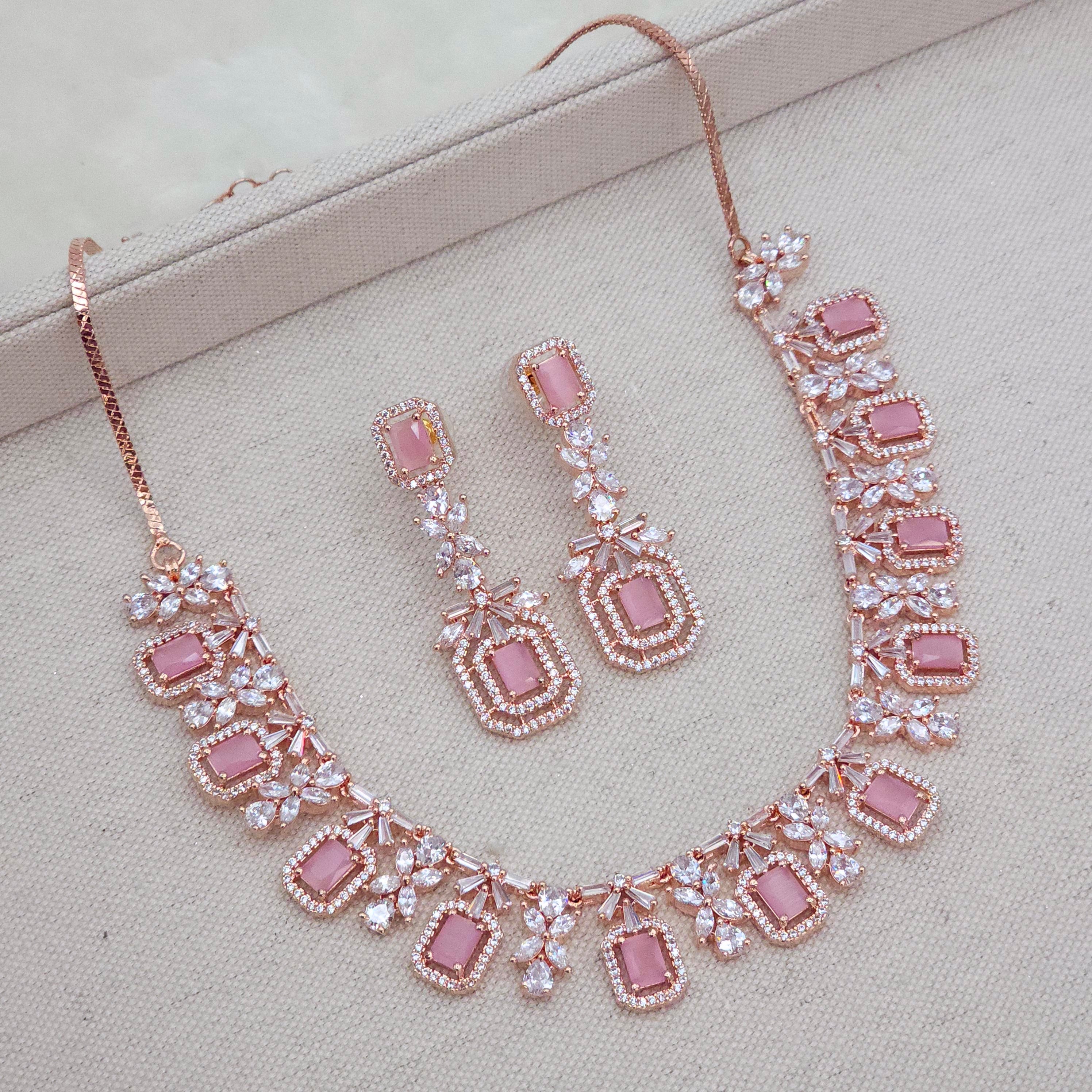 Indulge in the luxurious elegance of the Ruhani - AD CZ Choker Necklace set. The beautiful combination of Rose Gold and Pink Stone, paired with American Diamond CZ, creates a stunning look. With a necklace measuring L22cmxW2.5cm and earrings measuring L5cmxW1.5cm, this set is the perfect addition to any ensemble. Each piece is carefully crafted to exude sophistication and exclusivity. Please note that there may be slight color variations due to lighting in our photos.