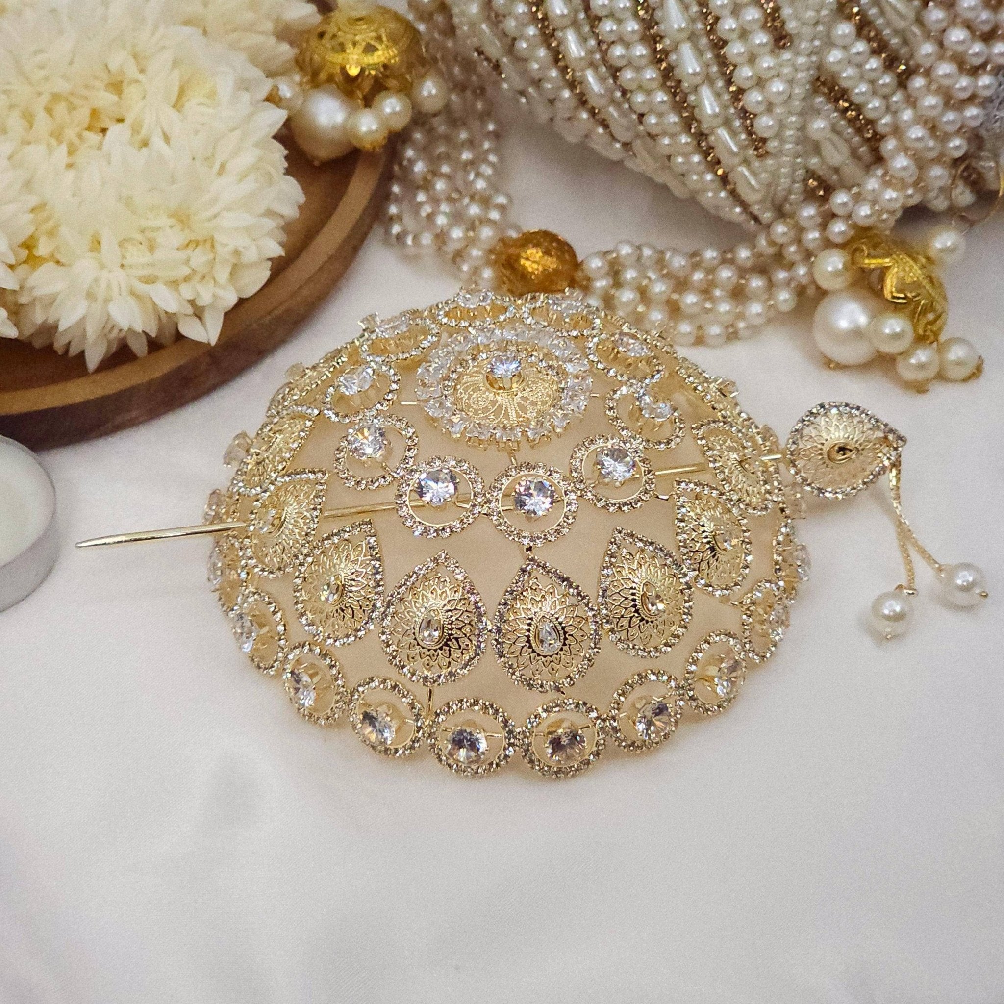 ✨ Elevate your ethnic look with our exquisite American Diamond CZ Hair Bun Holder And Pin Accessory – a handcrafted Indian Hair Bun Holder And Pin designed for bridal wear, festive occasions, and traditional charm.