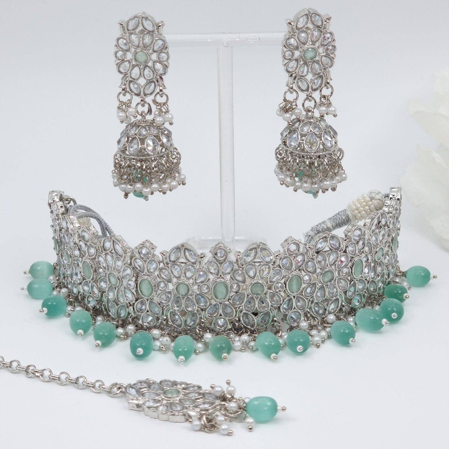 ✨ Elevate your ethnic look with our exquisite Husna - Silver Polki Choker Necklace - Mint – a handcrafted Indian Necklace designed for bridal wear, festive occasions, and traditional charm.
