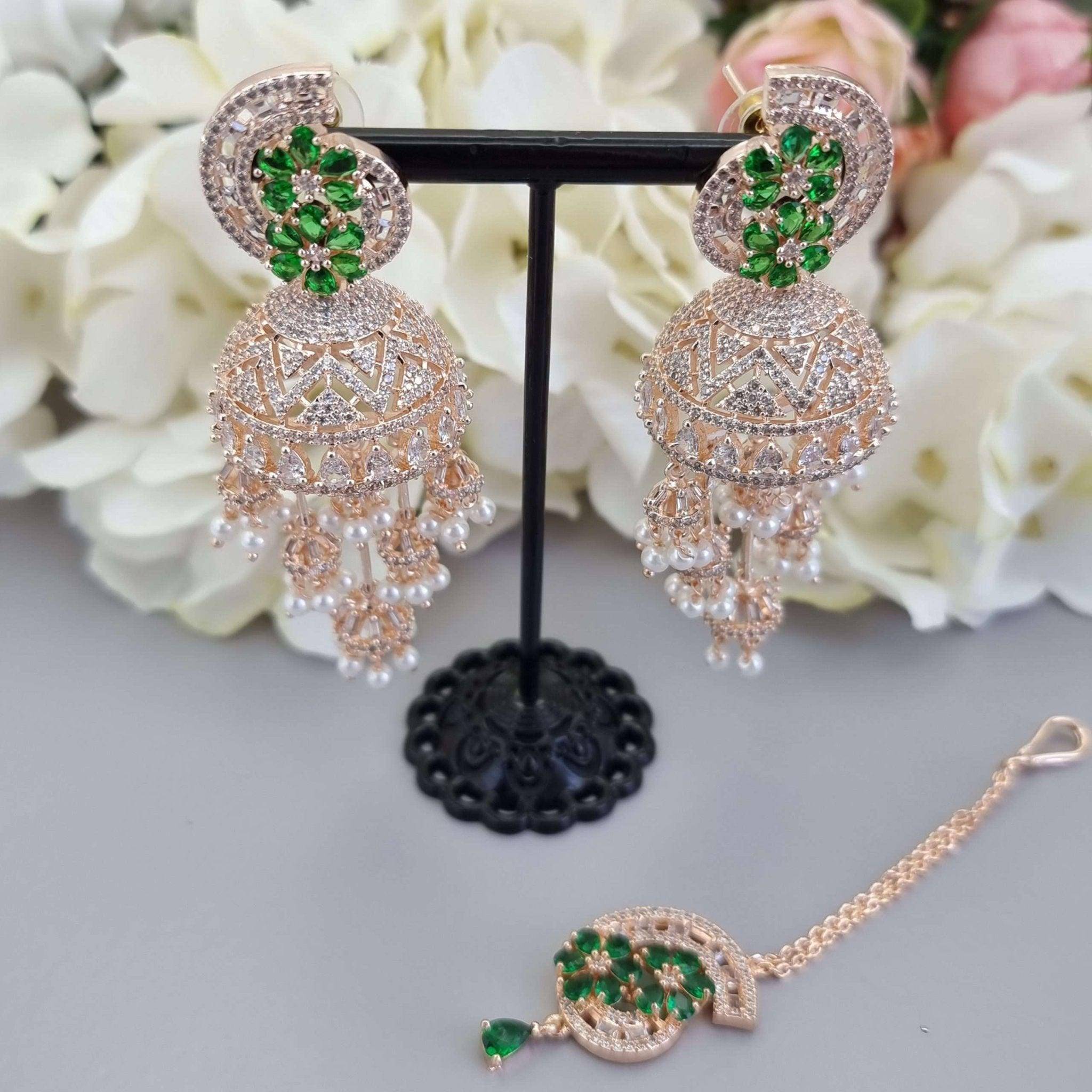 Jhumki Tikka Set Rose Gold Green