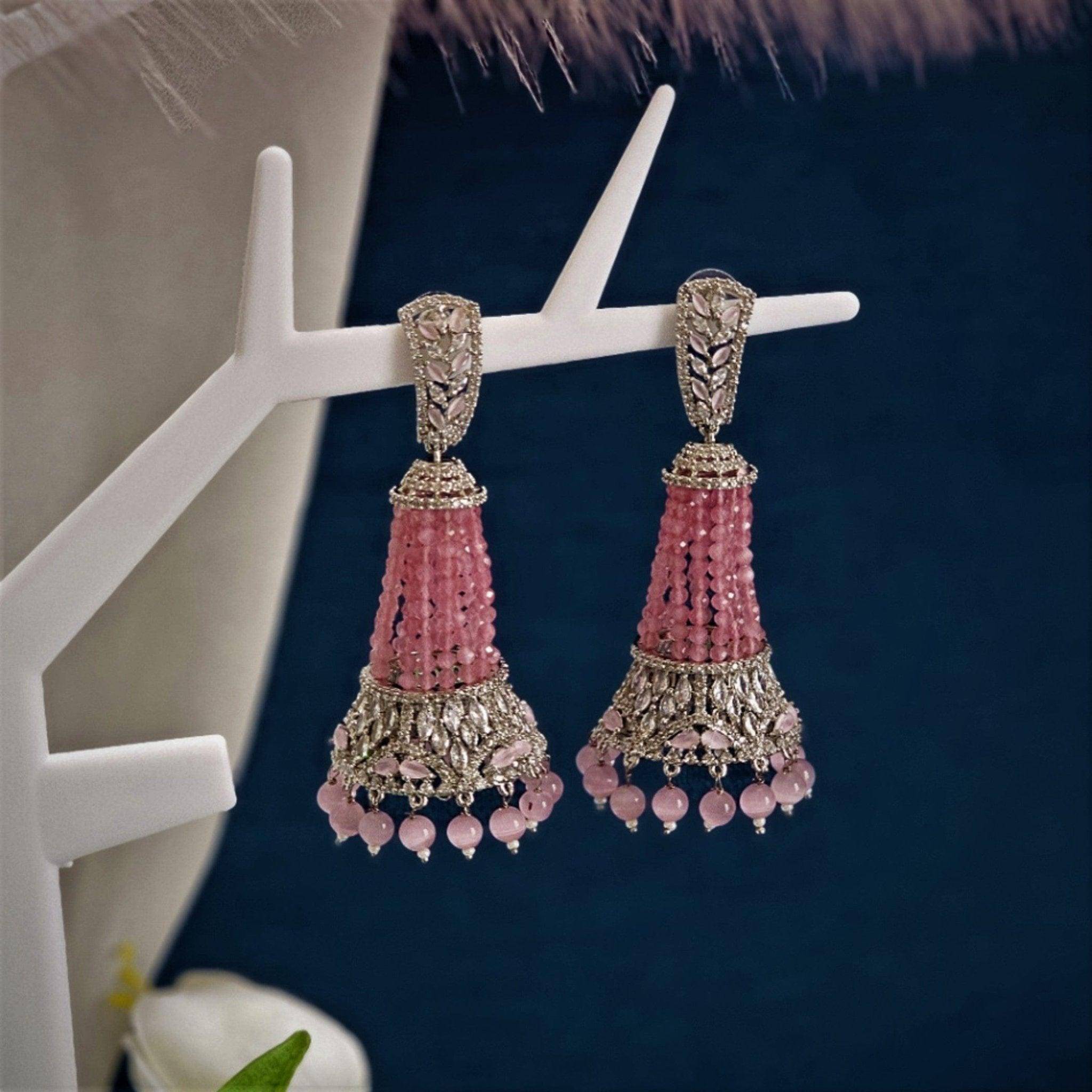 ✨ Elevate your ethnic look with our exquisite Rosa - Pink Silver AD and Pearl Jhumki Earrings – a handcrafted Indian Jhumki designed for bridal wear, festive occasions, and traditional charm.